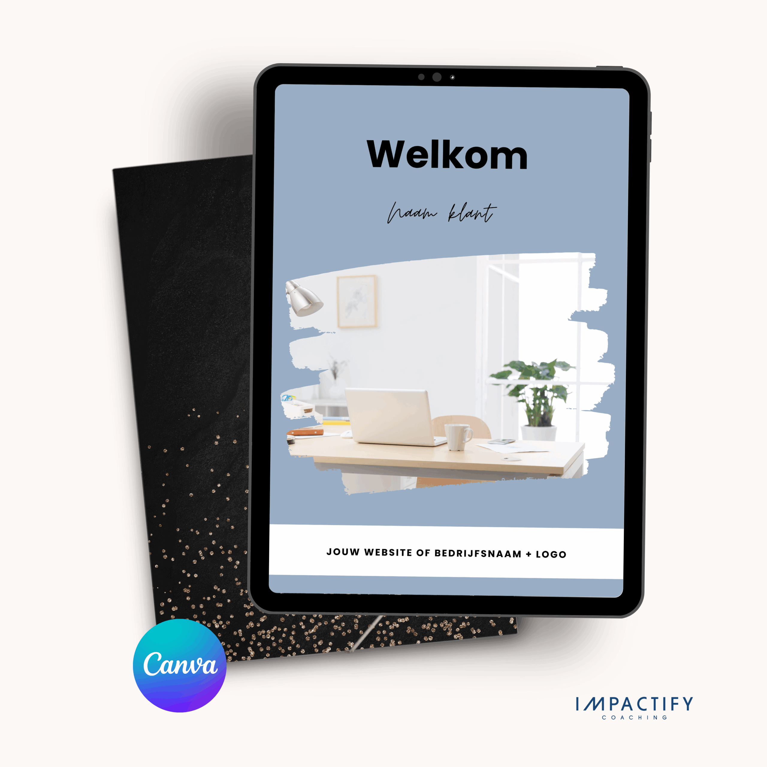 Geef jouw nieuwe klanten een warm welkom met dit sjabloon. Je kunt het design in Canva (met gratis account) aanpassen. Gebruik je eigen (merk) kleuren en voeg je logo toe. Je kunt de foto’s en tekst ook helemaal naar wens aanpassen.